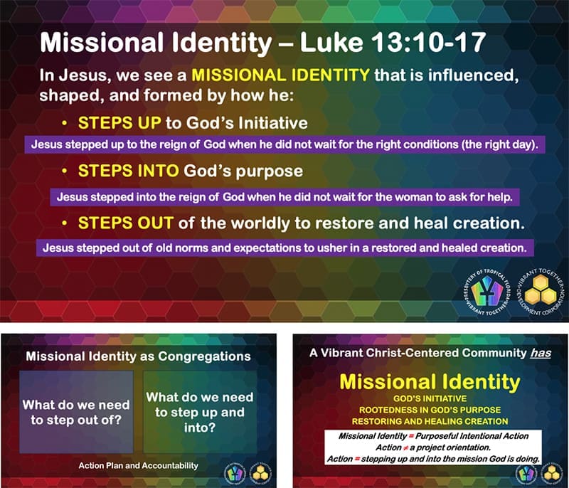 GP/SC Daris Bultena continued with Missional Identity of the Vibrant Together 2.0 Ministry Plan. It recognizes mission as based oriented to the community in which the congregation is placed. A missional community understands itself as joining God in the mission God is doing. Based on Luke 13:10-17, the following concepts and questions were asked of individual and of congregations: